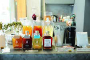 レジ横で販売する、オリジナルのドリップパックやジンジャーシロップ。シロップは瓶入り(200㎖1800円)と、大容量で注ぎやすいパウチタイプ(500㎖2800円)もあり。