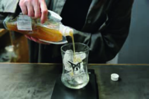 1をグラスに注ぐ。シロップが混ざった牛乳にエスプレッソを注ぎ入れることで、きれいな層ができる。