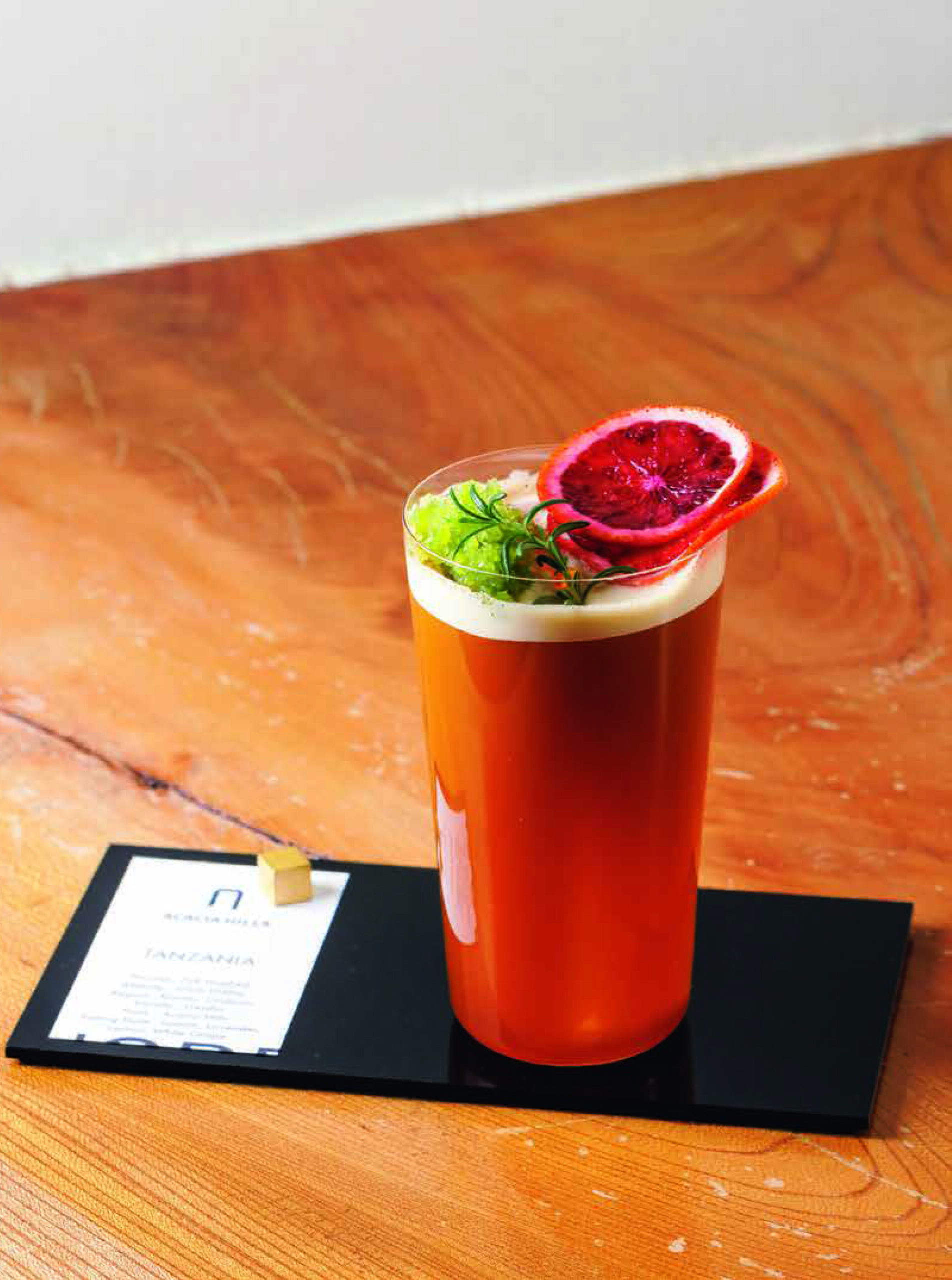 グラスに注ぎ、砕いたグラニテとブラッドオレンジ、ローズマリーを飾る。