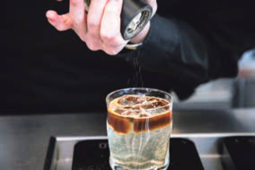 愛知県内でロースターやカフェなど4店舗を展開するグループの、旗艦店に当たるのが『イムオムコーヒー』だ。同店では個性豊かなシングルオリジンに特化し、常時9種類ほどをラインナップ。豆の個性を軸に、多彩なドリンクレシピを考案している。全品に共通するコンセプトは、「新しいおいしさに出合う驚きやワクワク感」。アイスのエスプレッソドリンクも個性的で、写真のメニューは自家製スパイスシロップを使った、スパイシーでキレのあるエスプレッソトニック。エスプレッソの豆は、アナエロビック ナチュラルのエルサルバドル。豆の華やかさとプルーンのような甘みを、スパイスシロップとグラインドしたブラックペッパーが心地よくひきしめる。