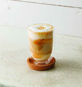 「当店でご用意するベトナムコーヒーはそのままでも個性的ですが、よりその個性を多様に楽しめる提案をするため、アレンジドリンクに力を入れています」と代表の細野彩良さん。「ピーナッツバターラテ」は、『DOUBLE COFFEE』の中深煎りの豆「No.20」を使ったアレンジ。「No.20」は焙煎する際にバターオイルを加えており、深いコクがあるのが特徴。ピーナッツバターとキャラメルシロップ、牛乳をブレンドしたベースの香ばしさに、バターが香るコーヒーがよく合う。2023年秋提供の商品。