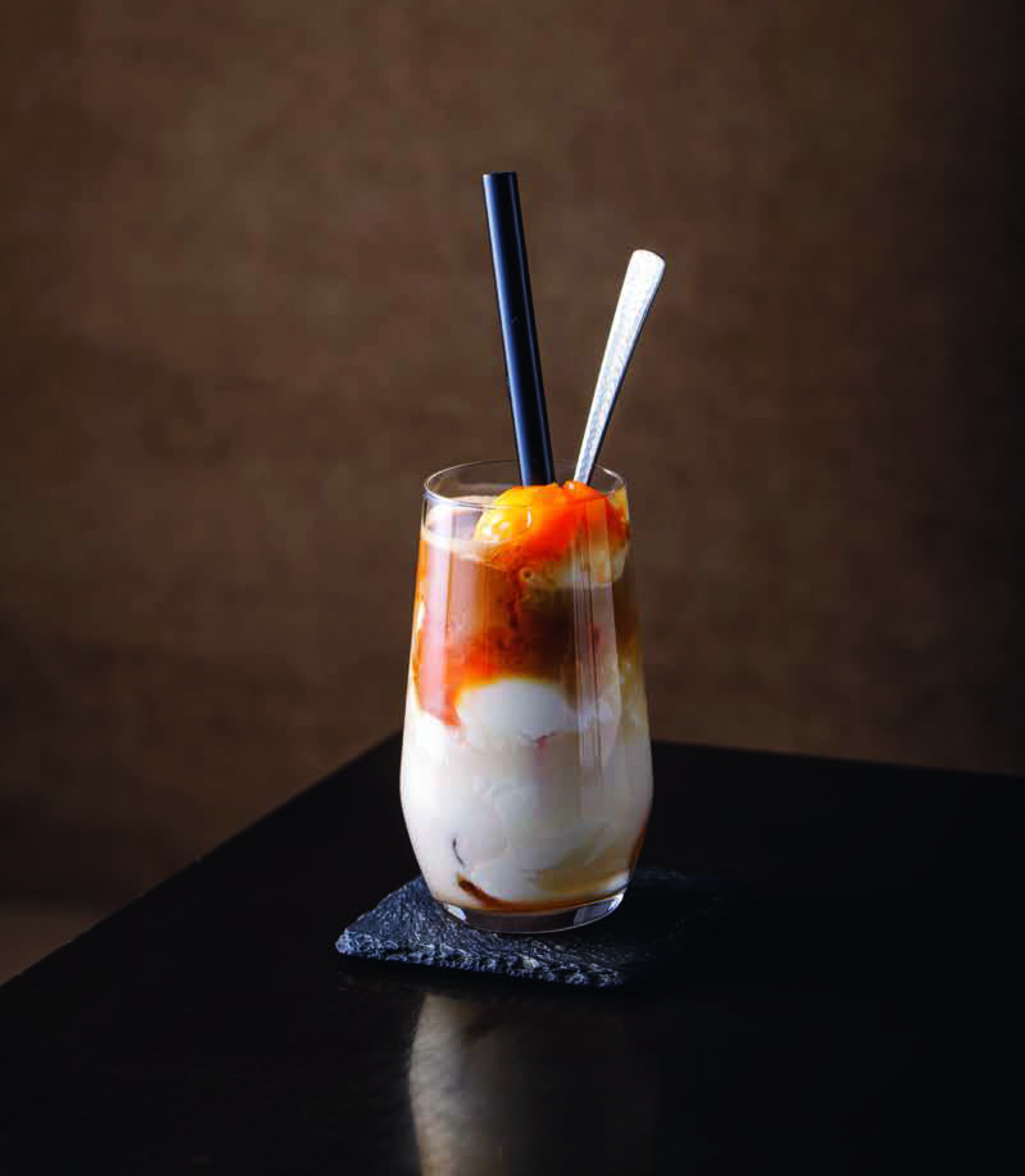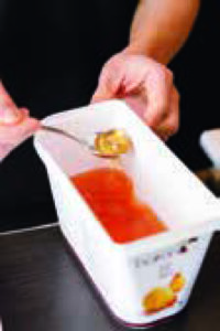 ストローをさし、アプリコットソースを回しかける