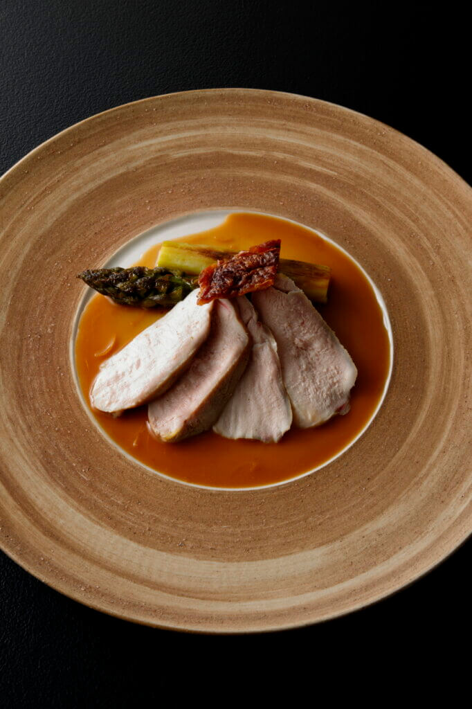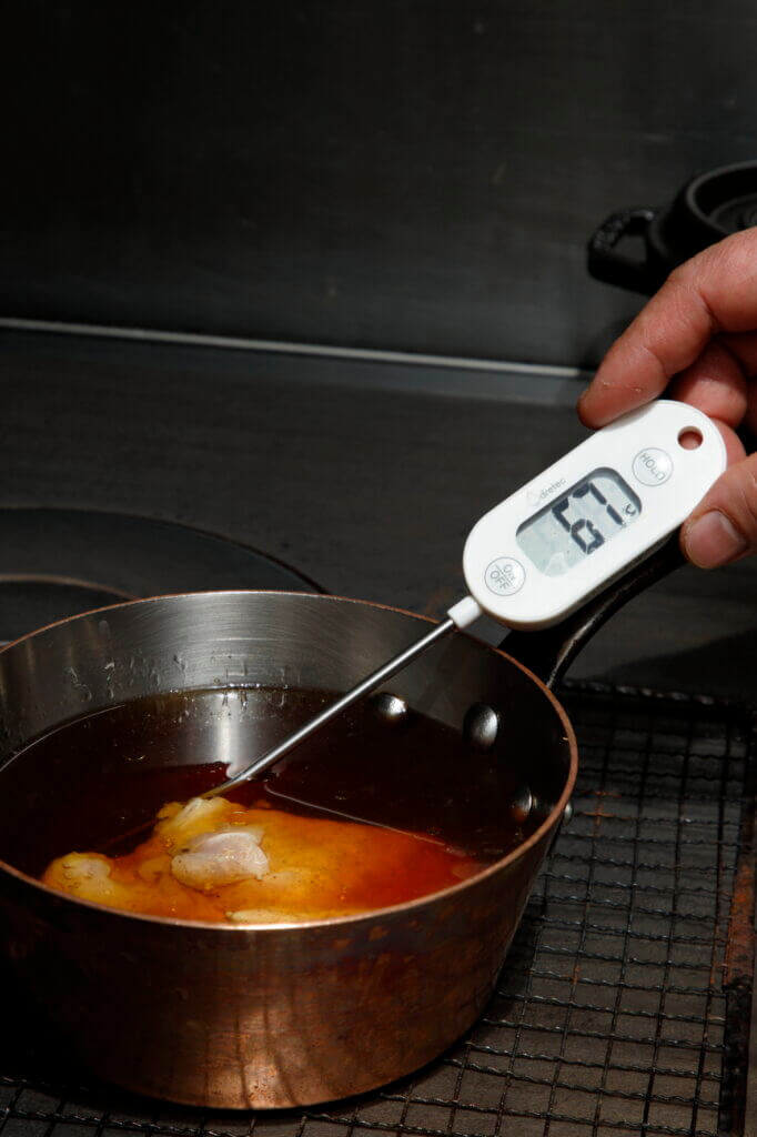 素材をやさしく包み込むような火入れで、しっとりとしたジューシーさと、クリアな香りを生み出すポシェ。最近では真空調理が定番化し、出番は少なくなりつつありますが、ほかの調理法では代替できないポシェならではのおいしさを、谷シェフは今も変わらず大切にしています。