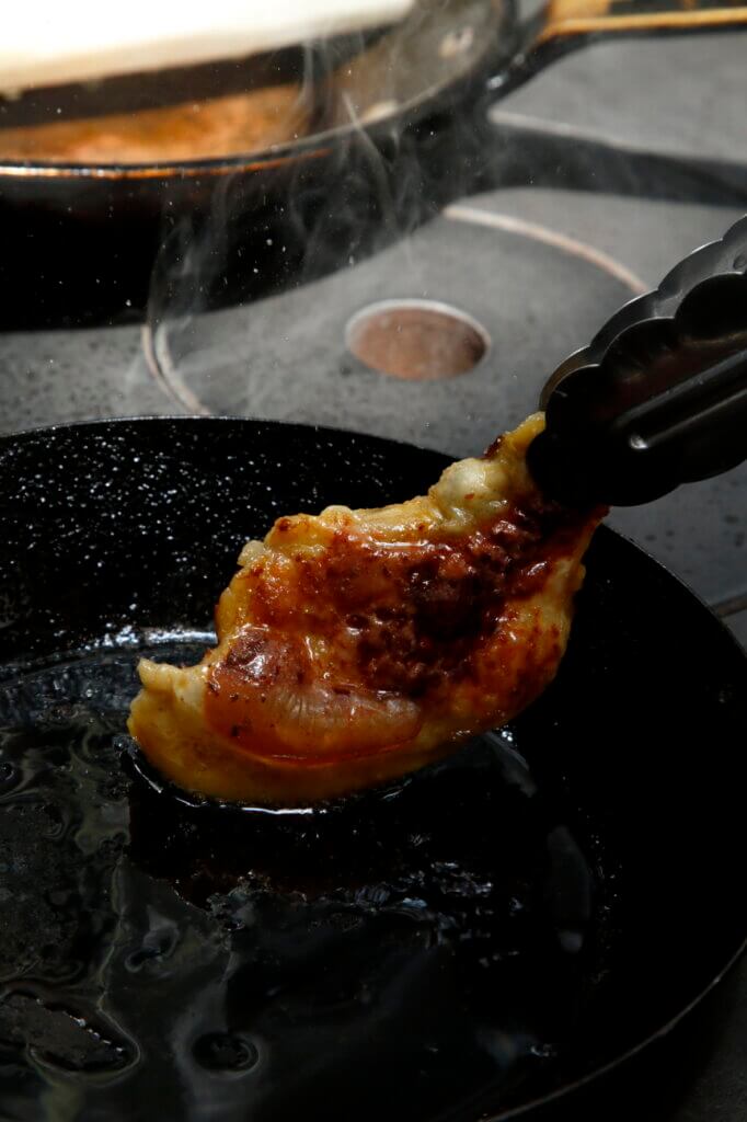 皮下脂肪がたっぷりついた皮は、肉からはがしてフライパンでカリカリになるまで焼き、香ばしさと食感を料理のアクセントとして生かしています。