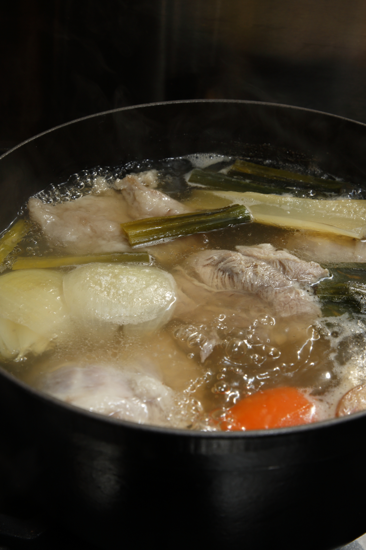 煮込み料理は、弱火でじっくり煮るのが定石だと思われがちですが、温度が低いとアクが浮きづらく、不純物が対流して液体が濁りやすくなります。そこで、軟水で作る場合は、はじめに沸騰させてアクを取ったら、そのあとも軽い沸騰状態が続くやや強めの火加減を保ちます。