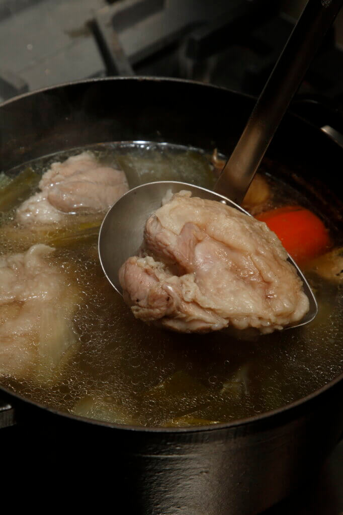 煮上がったら、肉を液体に漬けたまま粗熱を取り、肉汁を肉の中に戻します。その後具材を取り出し、煮汁を漉してそれぞれを冷やします。煮汁も冷やすことで脂と不純物が冷え固まるので、表面に固まった脂はスプーンでこそげ取ります。