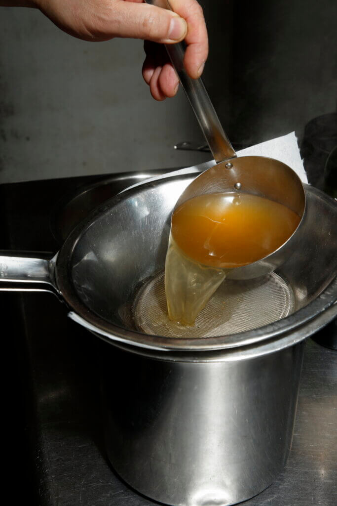 宮本シェフによれば、表面の脂は酸化していて胃がもたれやすく、取り除いた方がクリアな味わいに仕上がるのだそうです。さらに、液体は再度沸騰させ、紙漉しして不純物を徹底的に取り除きます。