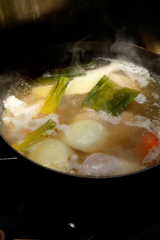 煮込み料理は、弱火でじっくり煮るのが定石だと思われがちですが、温度が低いとアクが浮きづらく、不純物が対流して液体が濁りやすくなります。そこで、軟水で作る場合は、はじめに沸騰させてアクを取ったら、そのあとも軽い沸騰状態が続くやや強めの火加減を保ちます。