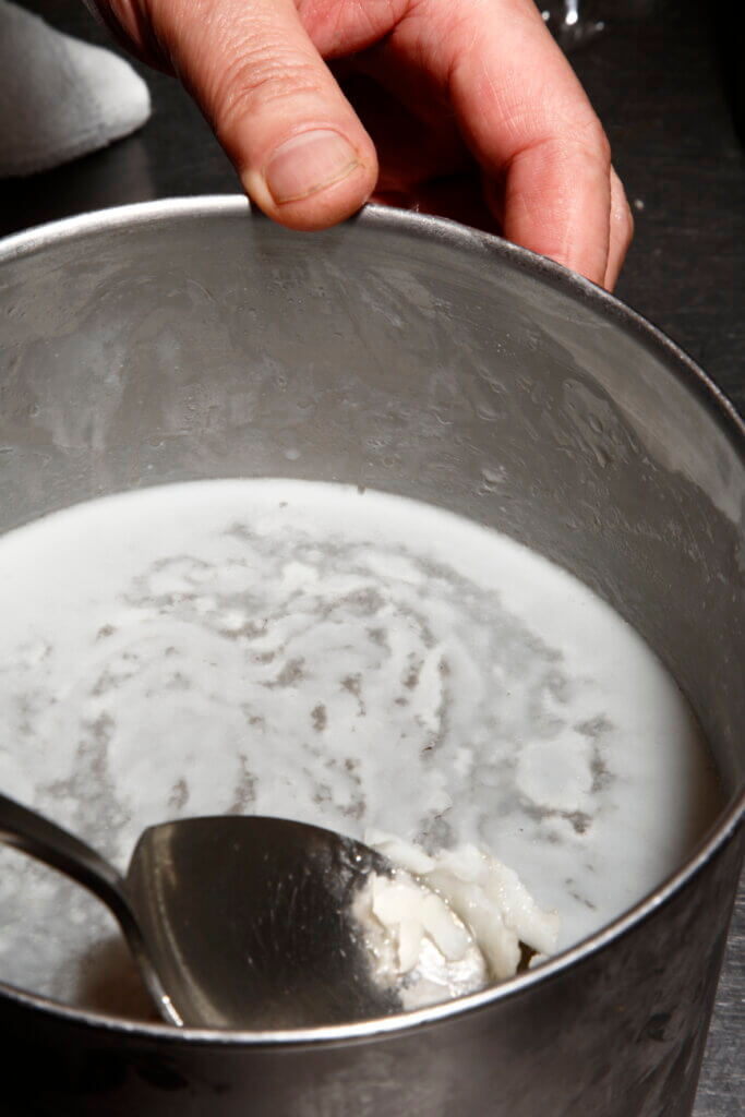 煮上がったら、肉を液体に漬けたまま粗熱を取り、肉汁を肉の中に戻します。その後具材を取り出し、煮汁を漉してそれぞれを冷やします。煮汁も冷やすことで脂と不純物が冷え固まるので、表面に固まった脂はスプーンでこそげ取ります。
