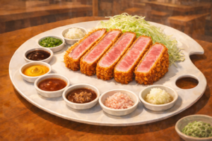 たとえば、とんかつ店の事例。銘柄豚を使ったとんかつは王道だが、この店では盛り付けを大胆に変えた。ロゼ色の断面をあえて上に見せ、パレットのような皿に8種類のソースや薬味を並べる。見た瞬間に写真を撮りたくなるビジュアルは、SNSで自然と広まり、遠方から足を運ぶ人も増えたという。味はそのままに、見せ方を変えるだけで、定番メニューが“記憶に残るランチ”になる好例だ。