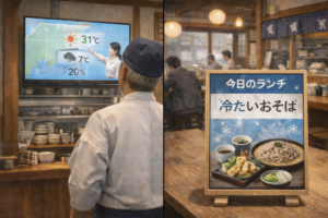 あるそば店では天気予報をランチづくりに活用している。「アイスクリームが売れ出す温度」について書かれた本を読んだことをきっかけに始めたことで、最高気温が高い日は冷たい麺、低い日は温かい麺と、気温に合わせて日替わりランチを変えることで、「今日はこれが食べたい」と自然に選ばれるようになった。