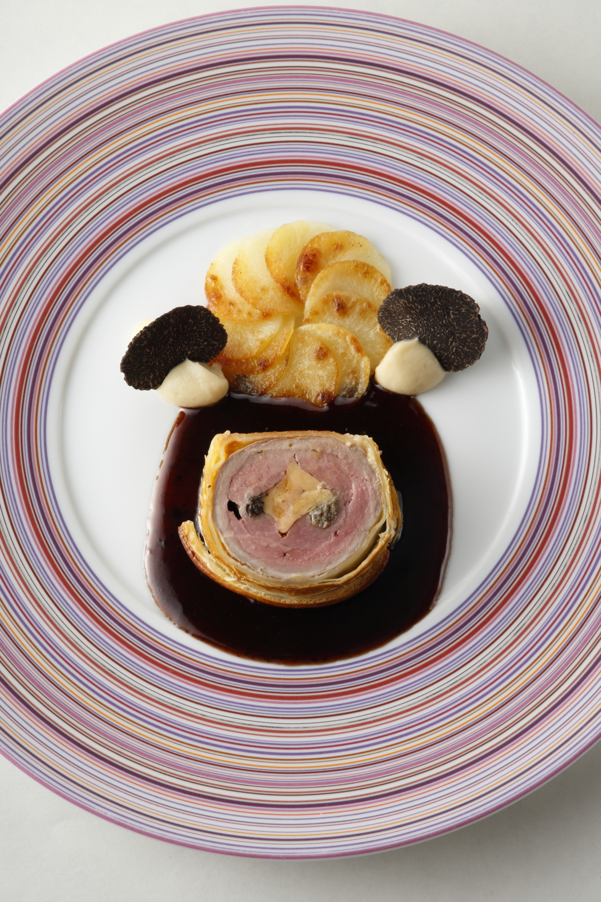 仔羊肉にトリュフ、フォアグラ、シャンピニョン・デュクセルを詰めてパイで包み、芳醇なソース・ペリグーを流したこのパイ包み焼きは、当時の日本人にはなじみの薄かった仔羊肉のおいしさを食通たちに知らしめるきっかけとなりました。