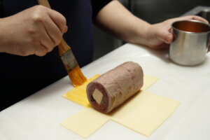手島シェフが励んでいるのは、料理の厳格化です。肉やフォアグラはグラムを測って厚みも均一化し、冷やす時間や焼成温度も厳密に計算。パイ生地も1mm厚さに統一することで、ファルスとのバランスや食感、食後の満足感までトータルで設計しています。