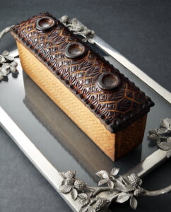 パテ・アン・クルートは、2、3日寝かせることで円熟味が増しますが、ファルスの水分が移ると生地の食感は損なわれてしまいます。そこで室田シェフは、水分を吸っても香ばしさを維持できる特製生地を考案。さらに背脂シートをパテとの間に挟むことで、焼成時に生地を揚げ焼き状態にし、ざっくりとした歯切れの良さを引き出しました。ふたつの工夫で、パテも生地もベストな状態で味わえるパテ・アン・クルートを完成させています。