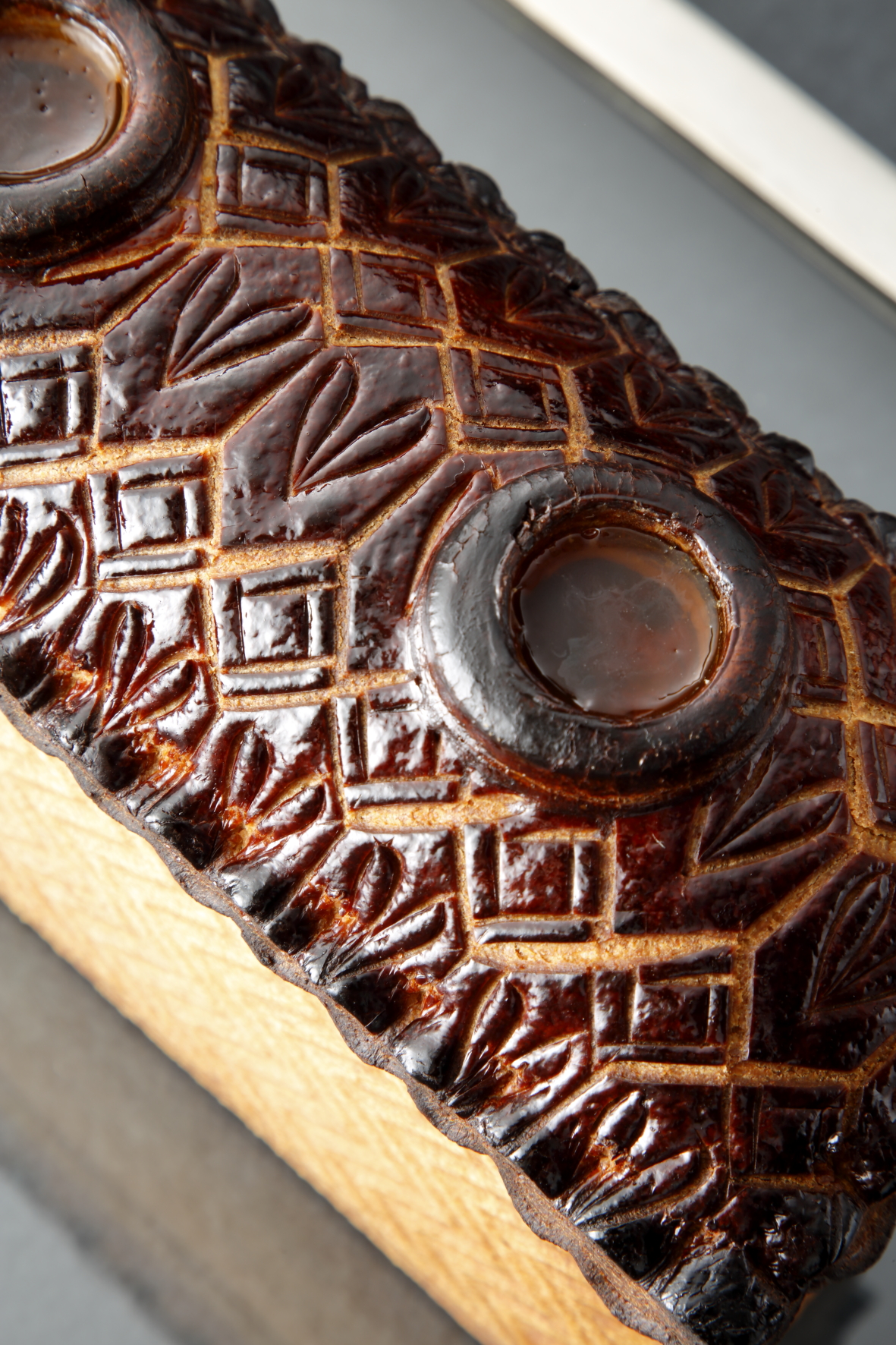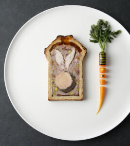 童話「ウサギとカメ」からインスピレーションを得て、パテのベースには、穏やかで淡白な味わいのウサギ肉を選びました。スッポンを思わせる力強い旨味のウミガメに寄り添うように、ウサギ肉が全体をやわらかく包み込みます。パイ表面には亀甲模様を刻み、断面にはウサギの姿が浮かび上がるように組み立てた、遊び心あふれる一皿です。