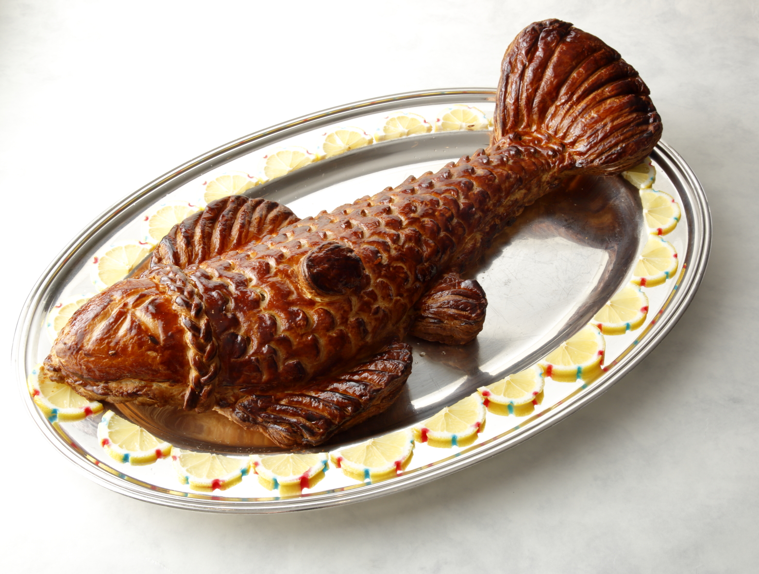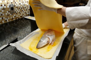 「魚を丸ごとパイで包むことで、頭や骨のゼラチン質が溶け出し、スズキの旨味も香りも余すことなく味わえます。パイ生地が蓋の役割を果たし、蒸し焼き状態にできるため、身の水分も抜けづらく、ふっくらと仕上がります。見た目の華やかさだけでなく、理にかなった手法なのです」