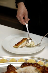 スズキはシェフ自身が目利きで選び抜き、3日ほど寝かせて旨味を十分に引き出してから使用します。215℃のオーブンで30〜40分、じっくりと時間をかけて焼き込むことで、パイ生地は香ばしく、中の魚はジューシーに。この絶妙なバランスが、70年以上愛され続ける理由です。