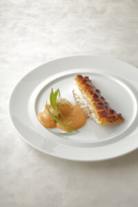 このグランメゾンで年間100本以上も提供されるスペシャリテが、スズキを丸ごとパイで包み、魚形に焼き上げた「スズキのパイ包み焼き ソース・ショロン」。焼き上がりを披露したのち、サービスマンが客席で切り分ける演出も含めて、その豪華かつ優美な姿は見る者を圧倒します。なんと、1人で1尾を平らげてしまう熱烈なファンもいるのだそうです。