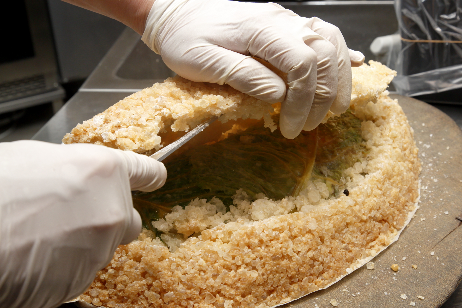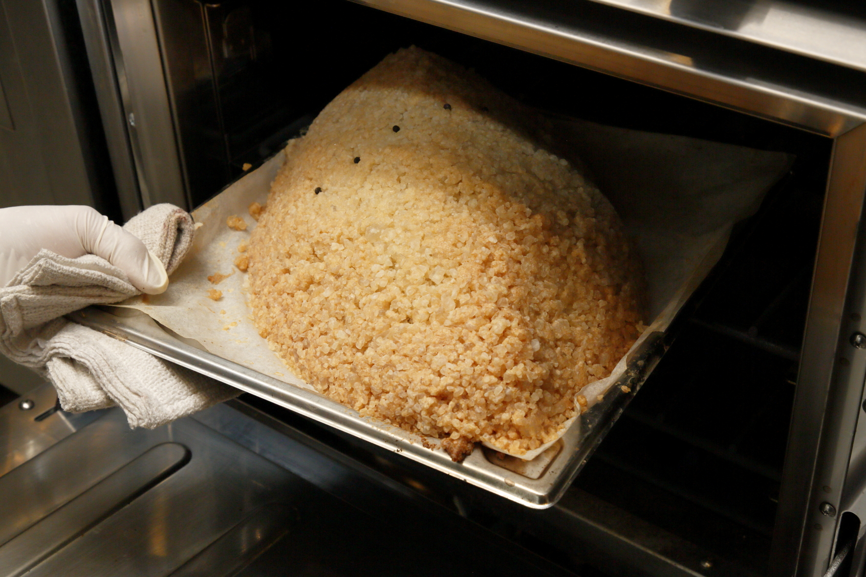 卵白と小麦粉を一緒に練り合わせた岩塩の衣で魚を丸ごと包み、オーブンで焼き上げる塩釜焼きは、手間と時間がかかるため、効率が優先される現在の調理場ではあまり行われなくなりました。