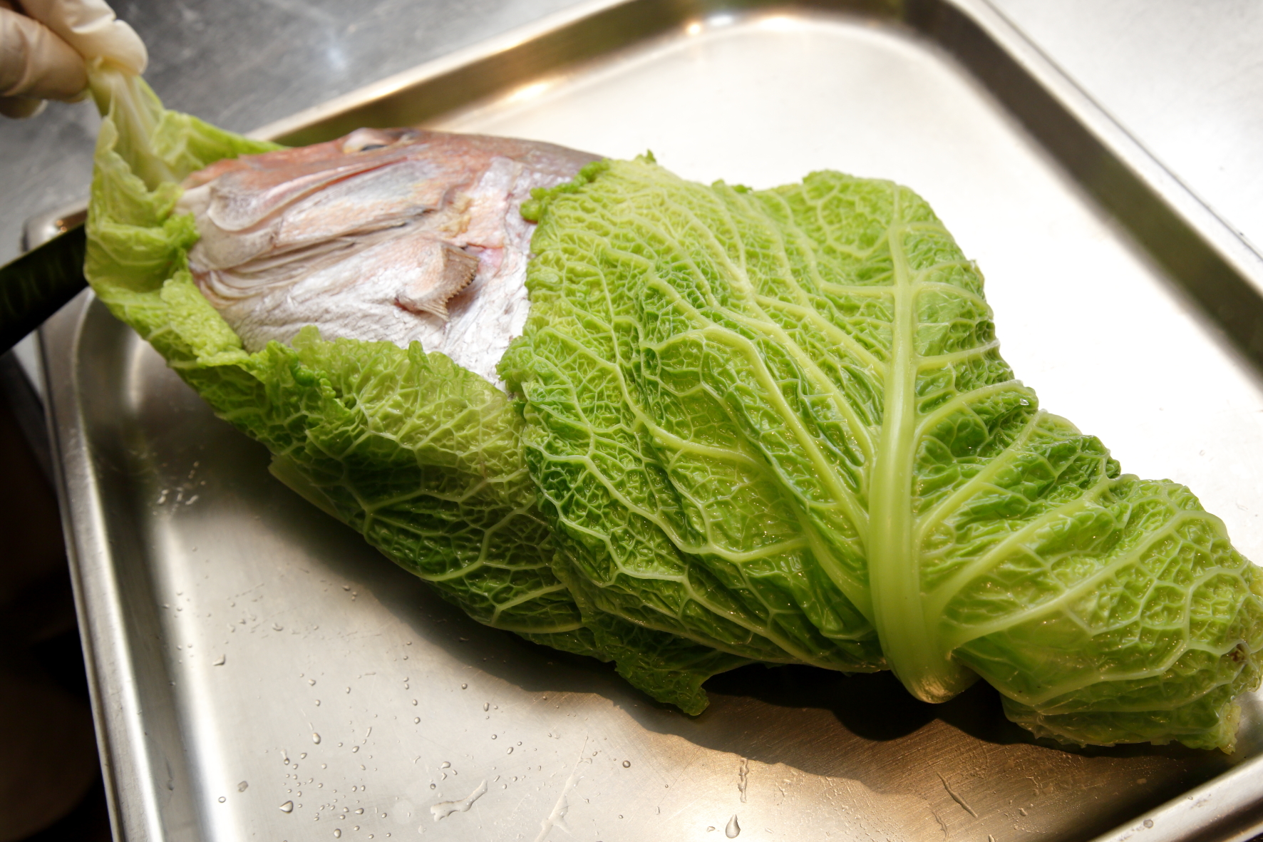 真鯛を直接塩釜に入れると塩が入りすぎてしまうため、ゆでたちりめんキャベツですっぽりと包みます。キャベツが塩の浸透をやわらげ、塩味の入り方を穏やかに制御してくれます。見た目は大胆ですが、味わいは繊細。このひと手間が、塩釜焼きの仕上がりを大きく左右します。