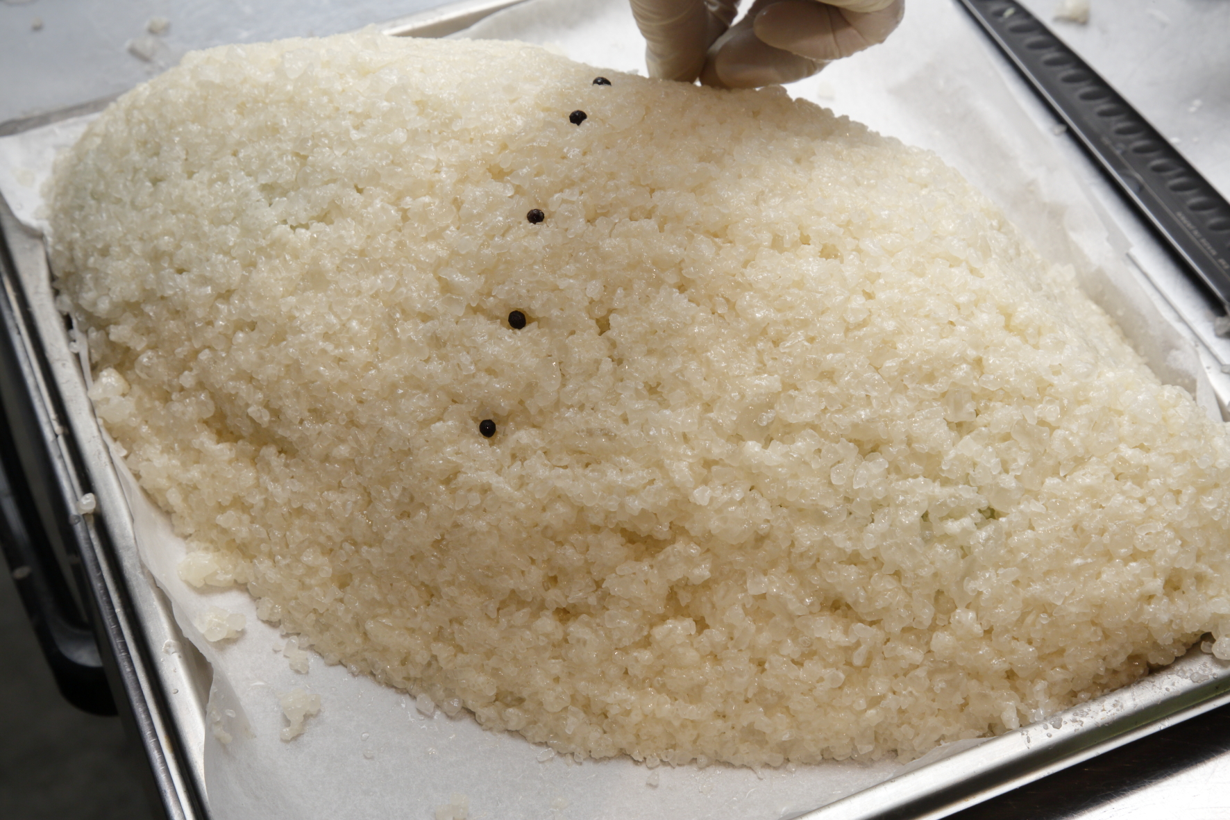 天板に塩釜を敷き込んで真鯛をのせたら、上から覆ってパレットで叩いて固めます。首の付け根はもっとも火が入りづらいので、こしょうで目印をつけておけば、焼き上がりを金串で確認するさいのよい目安になります。