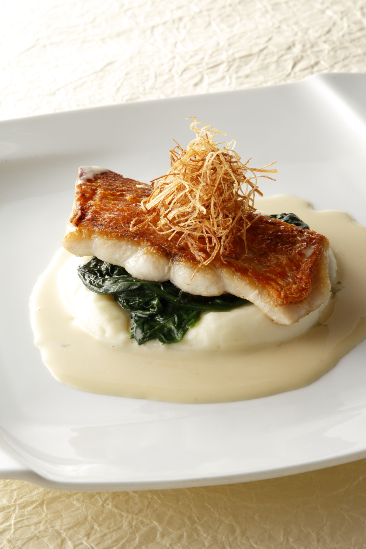 合わせるソースは、その日の気分や季節によってさまざまです。ブール・ブランをベースに、アルコールや香草、スパイス、海藻などでバリエーションを広げることもあれば、今回のようにフュメ・ド・ポワソンと生クリームをたっぷり使った古典的なソース・ヴァン・ブランで仕上げることもあります。皮はカリカリ、身はふっくら。完璧に焼き上げたポワレだからこそ、どんなソースとも見事に調和するのです。
