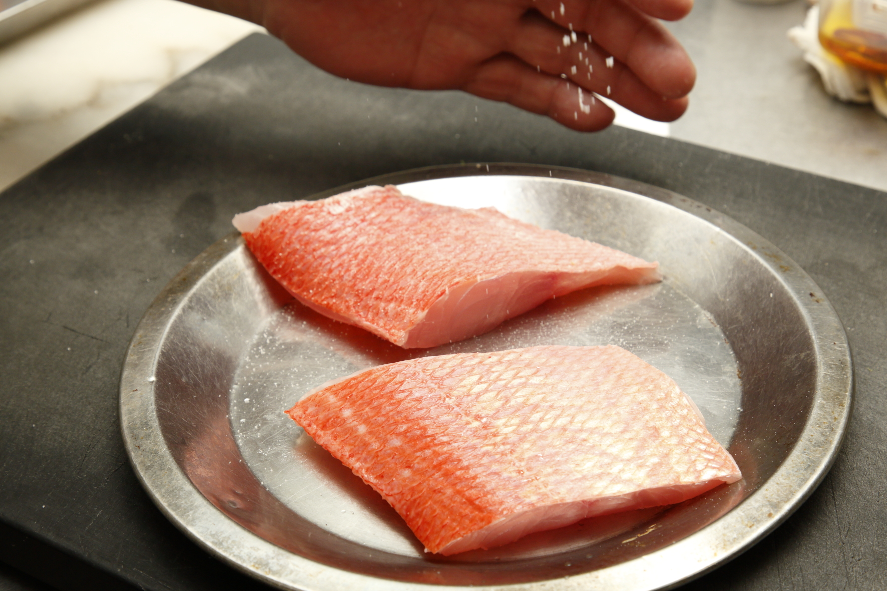 魚料理の成否を分けるのが、臭みの処理です。金子シェフは魚に塩とこしょうをしてから10分置き、出てきた水分をペーパータオルでていねいに拭き取ります。この水分には臭みが含まれているため、この一手間が仕上がりを大きく左右します。