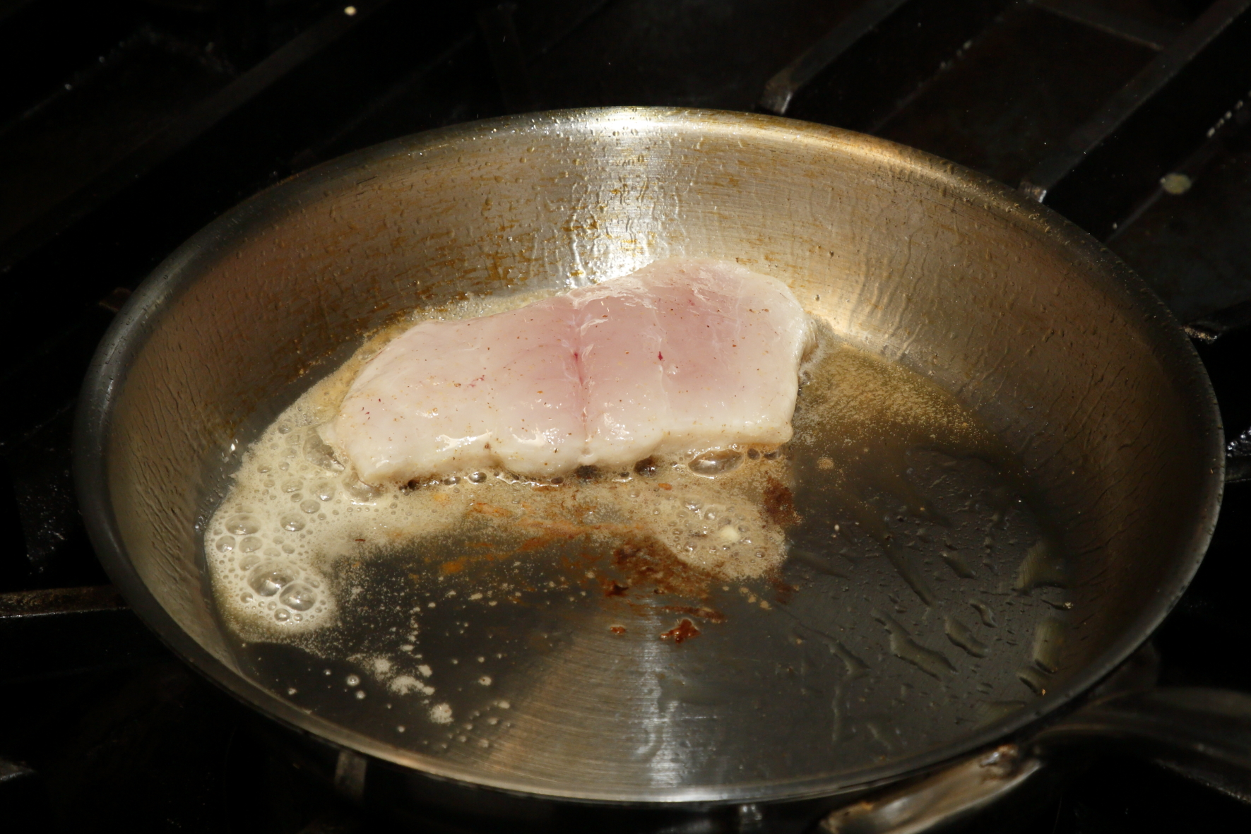 ステンレス製フライパンの最大の利点は、蓄熱性の高さです。皮側をしっかり焼き上げた時点で火を止め、ひっくり返した後は余熱だけで身側を加熱します。この方法なら、火の入れすぎでパサつくことなく、皮はカリカリ、身はふっくらジューシーな理想的な状態に焼き上げられます。