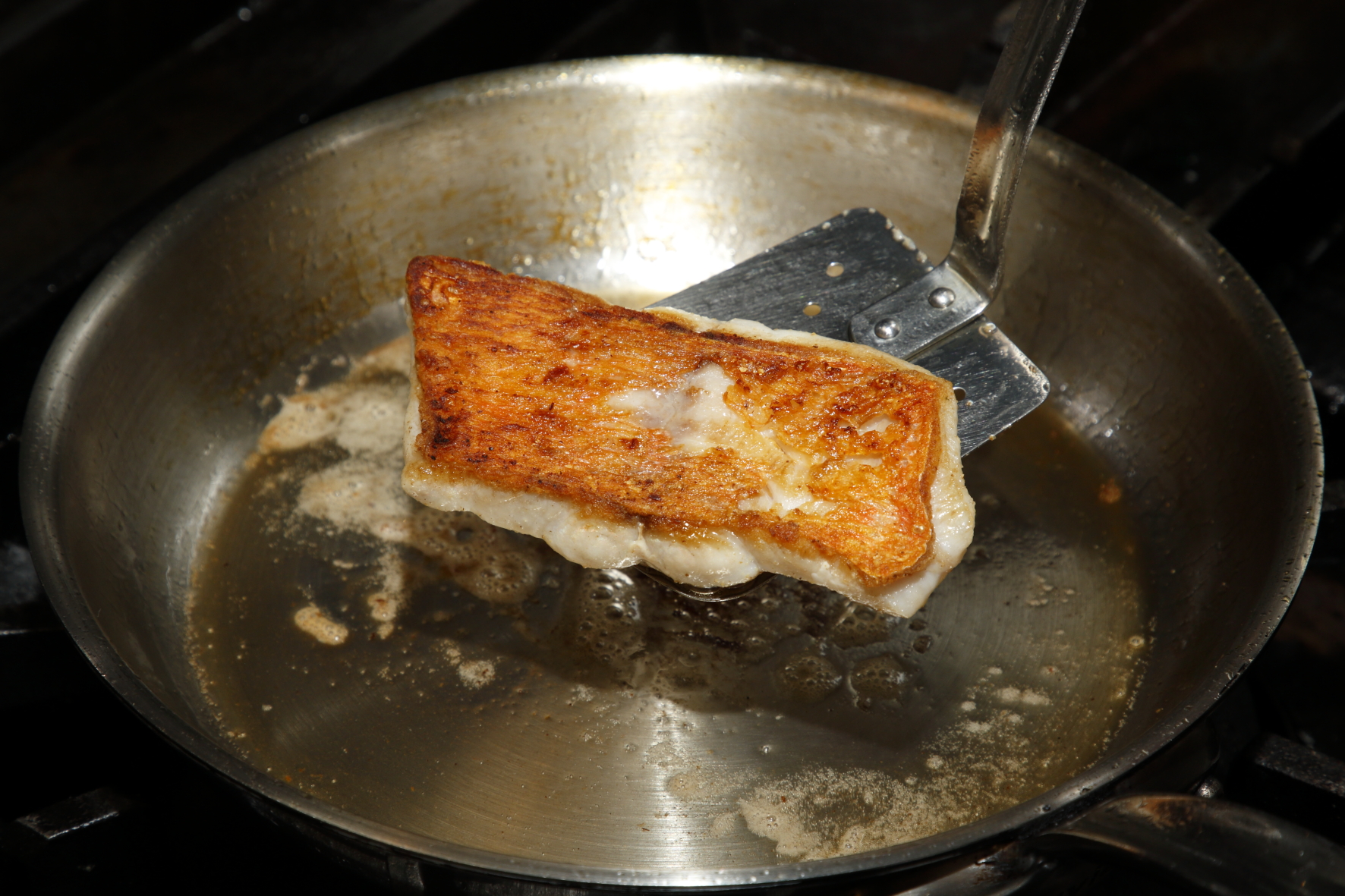 さらに、ポワレ中の油にも魚の臭みが移ります。金子シェフは調理の途中で油を捨てて新しい油に取り替える作業を2、3回繰り返します。手間はかかりますが、こうすることで臭みがさらに抑えられ、クリアな味わいに仕上がります。最後にバターを加えて香りを魚にまとわせれば、香ばしく風味豊かなポワレの完成です。