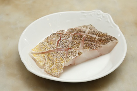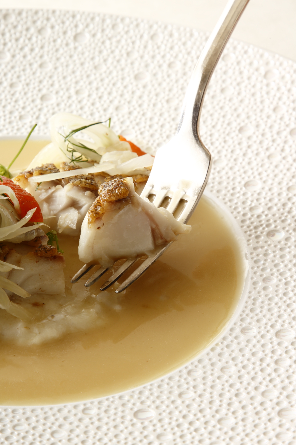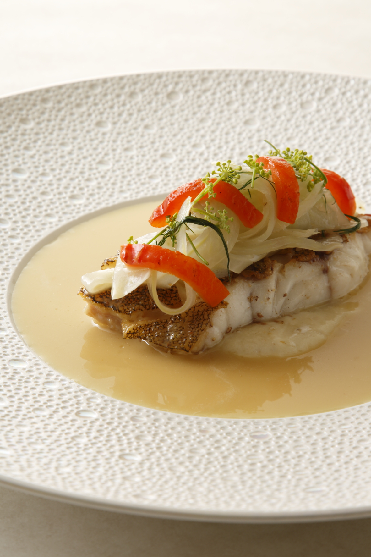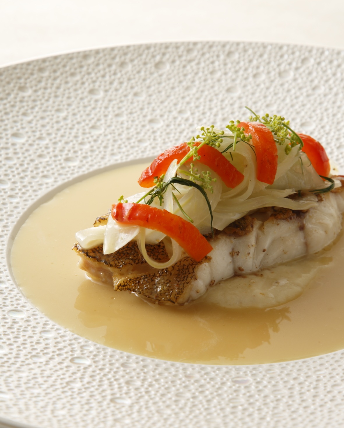 オオモンハタはハタの中では比較的身が薄いため、上火210℃、下火200℃のオーブンに3分ほど入れるだけでジュスト・キュイ(ちょうどよい火入れ)になります。