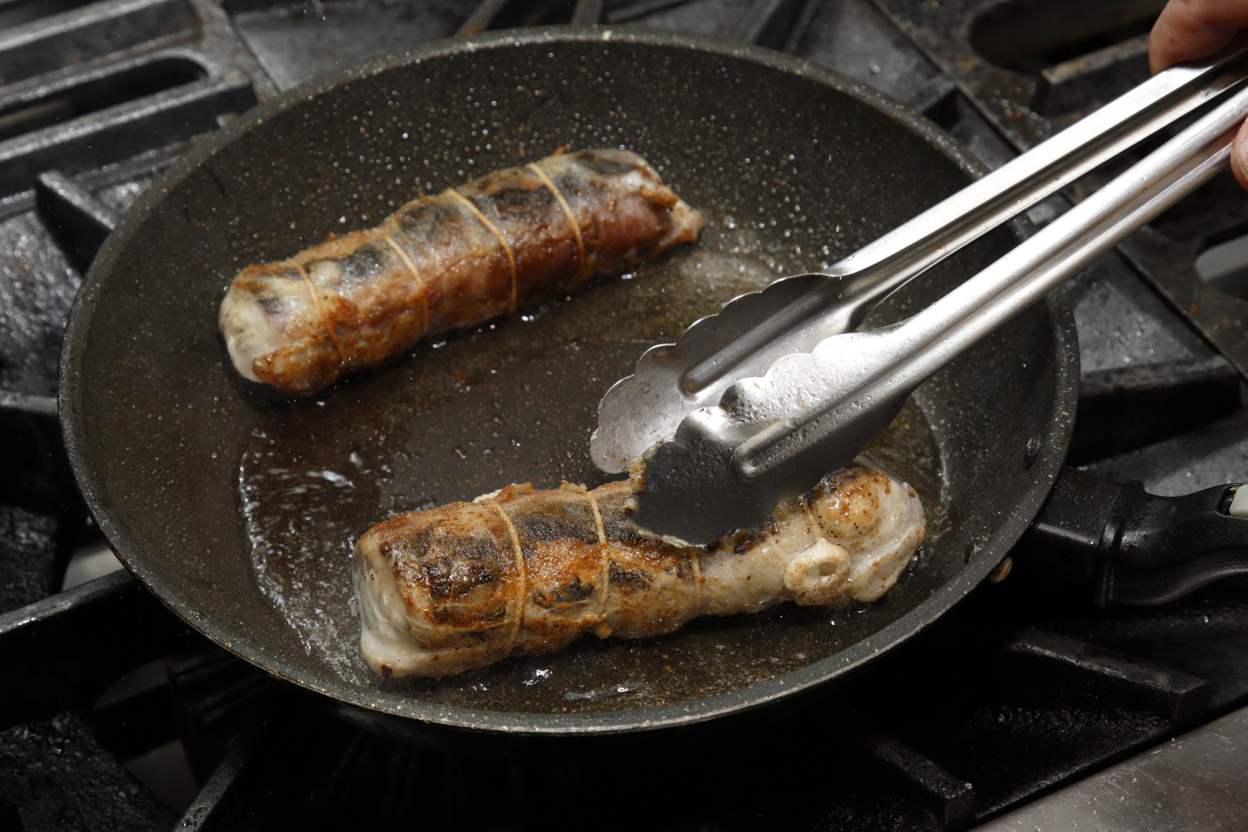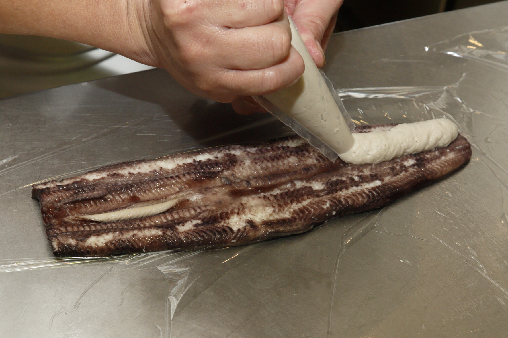 次に、ウナギ100%のムースを絞り出してマトロートと同じ筒形に整え、網脂で巻いて表面を香ばしく焼き上げます。こうしたていねいな下処理が、日本人が納得できるおいしさを生み出します。