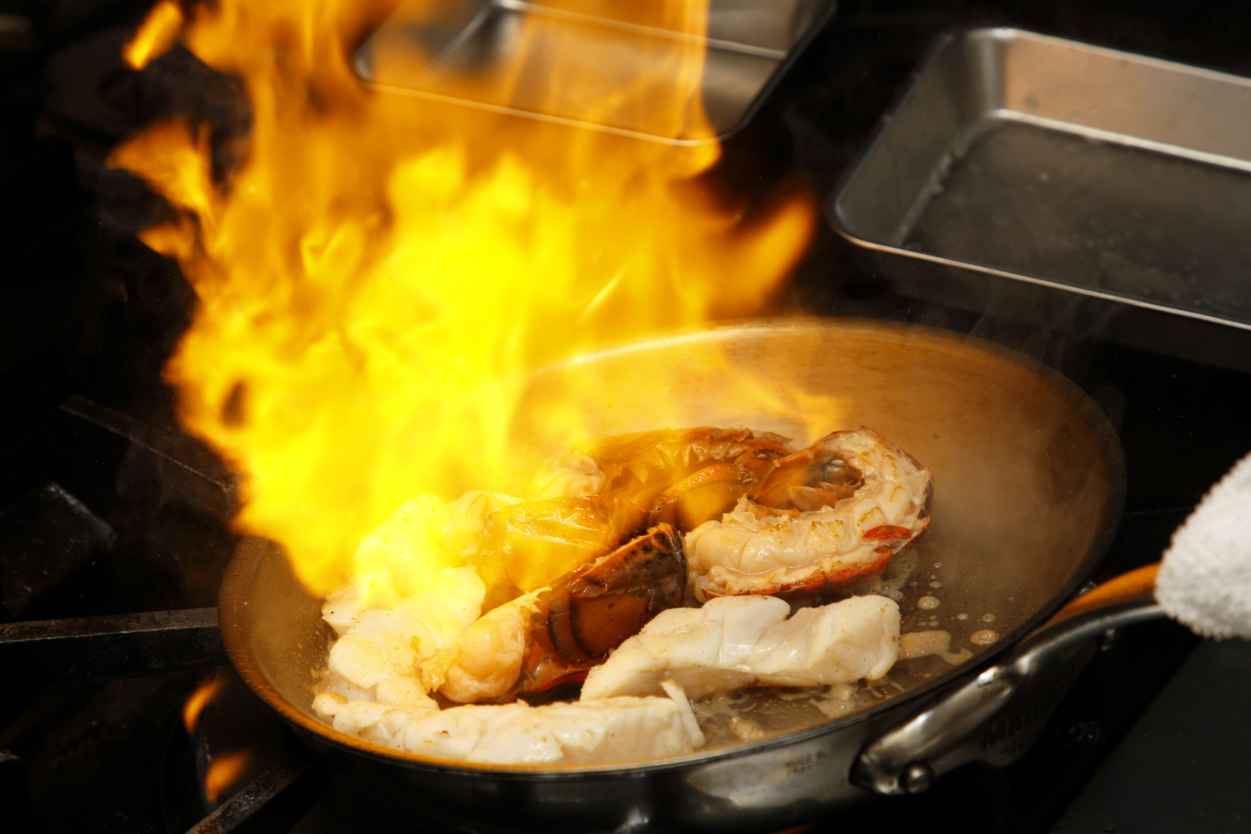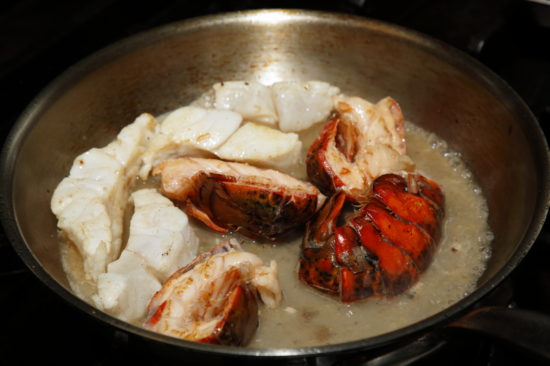 作り方は、まず、フライパンを強火で熱し、オマール海老を断面から焼きます。表面の色が変わったら裏返し、オオモンハタを加えて色がつかないように炒めます。バターとエシャロットを炒め合わせたら、コニャックでフランベし、ノイリー酒を加えて煮ていきます。