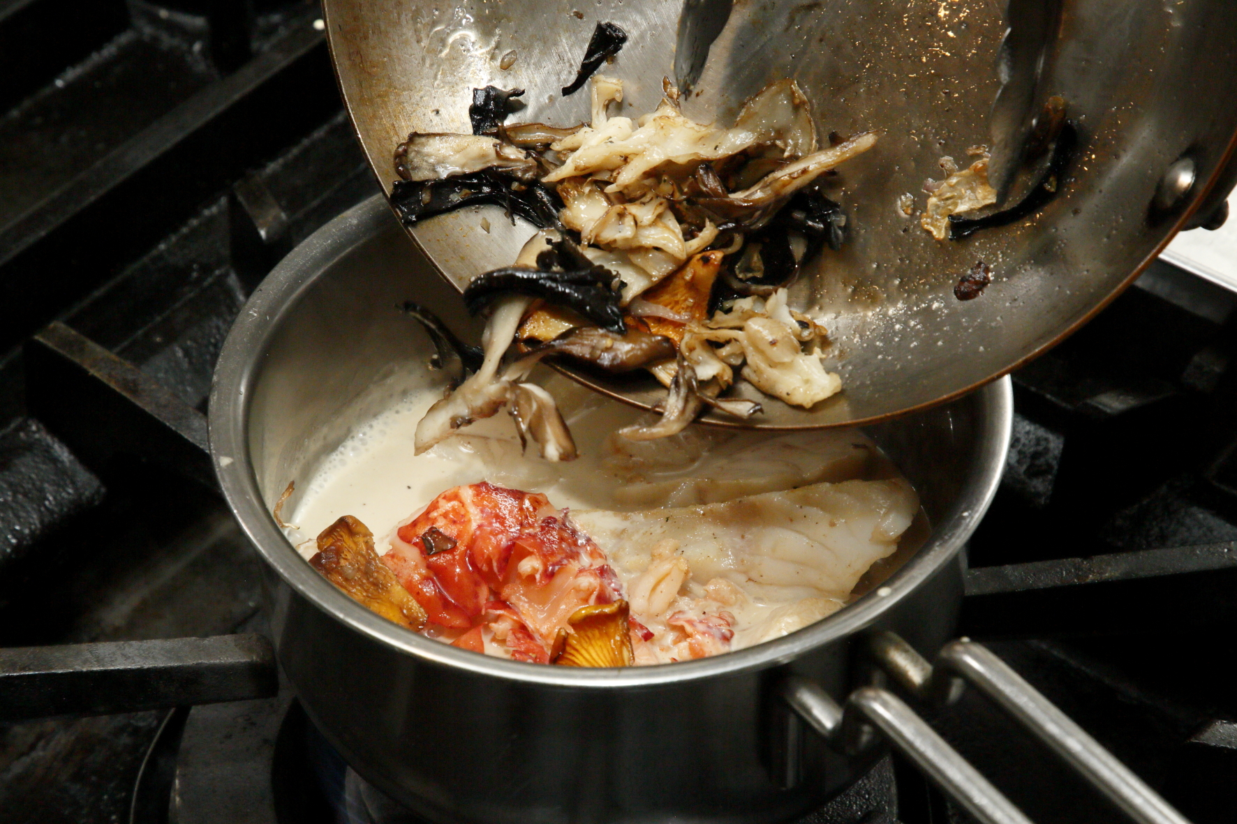 魚介を取り出した後の煮汁は軽く煮詰め、野菜のブイヨン、生クリーム、ラングスティーヌのジュを順に加えてさらに煮詰めていきます。シノワで漉した煮汁に魚介を戻し、あらかじめソテーしておいた茸を合わせてさっと煮れば完成です。