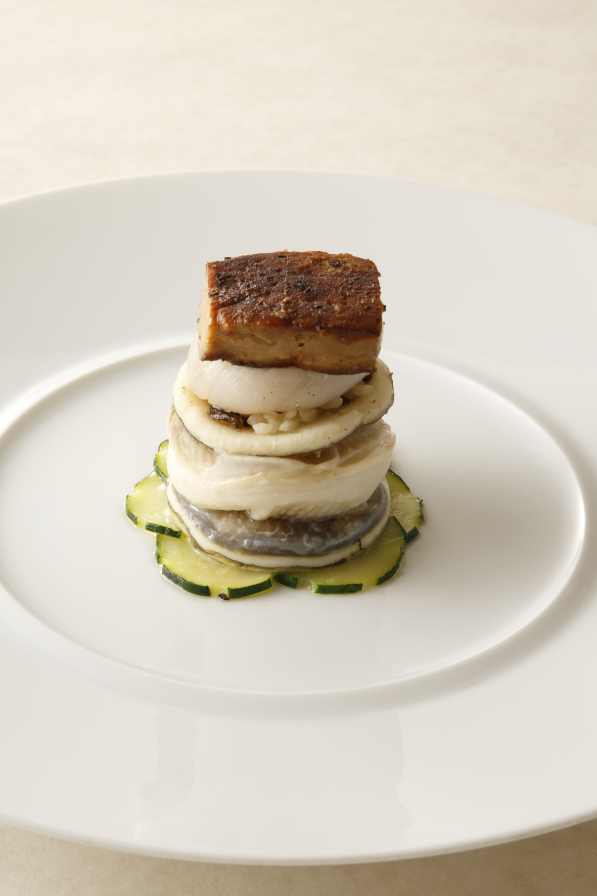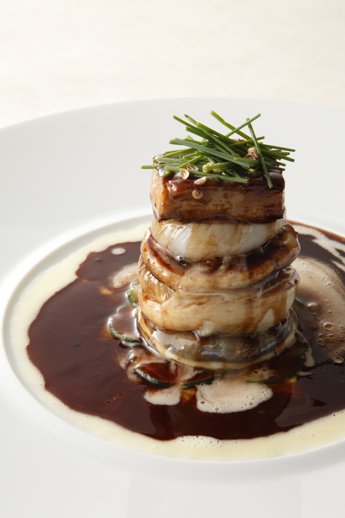 穴子を型に詰めて美しく蒸し上げ、ホタテとフォアグラのポワレとともに味わう料理は、30年以上前から美食家たちに愛されてきた宮本シェフの不動のスペシャリテです。