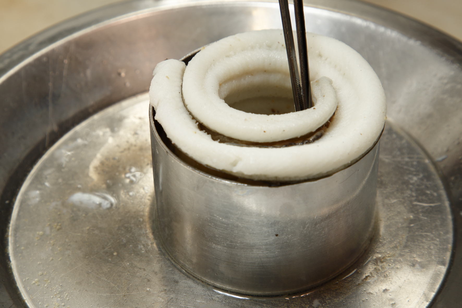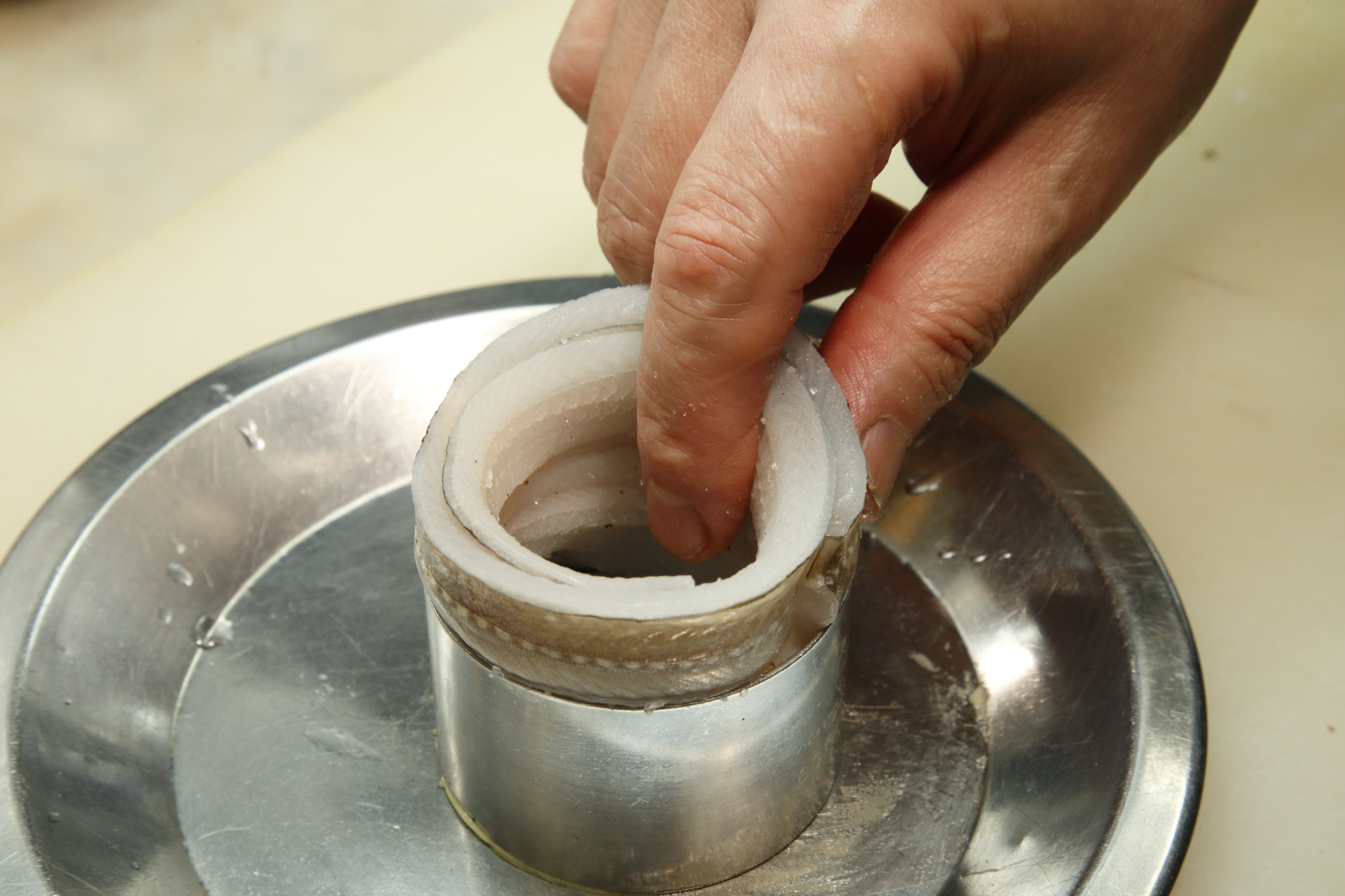 背開きにした穴子は、中骨を取って皮が外側になるように丸め、セルクルに詰めて蒸し上げます。スチームコンベクションの設定は85℃で20分。骨が口に当たらないくらい柔らかく、それでいて身の脂が抜けずにふんわりと仕上がるベストな条件です。温度が高すぎると焼き縮みが起こり、逆に低温で時間をかけすぎると身崩れしてしまいます。