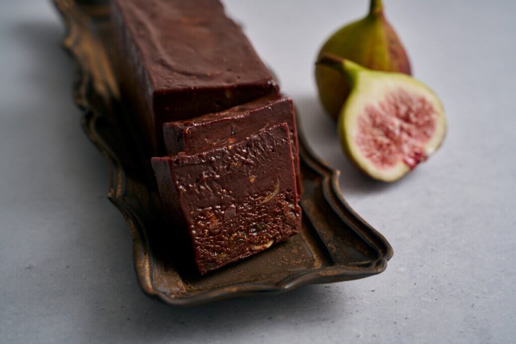小麦・白砂糖・乳製品・卵不使用で、特定原材料8 品目※、動物性食品を使わずに作る濃厚テリーヌ。羅漢果(らかんか)という果実からとれる天然の甘味料を使用した自家製の低糖質チョコレートをベースに、アーモンドミルクのミルクチョコレートや、大豆由来のクリームと合わせたチョコレートスイーツです。テリーヌの中には食感のアクセントとなるいちじくを入れ、とろけるショコラに合わせたぷちぷちとしたいちじく煮の食感が楽しめます。植物由来の原材料のみを使用したプラントベースで、卵や乳製品アレルギーの方にもお召し上がりいただけます。ヴィーガン主体の方、8 大アレルゲンを取れない方にもぴったりです。