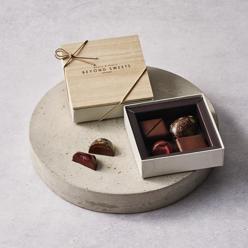 小麦・白砂糖を一切使用しない、まるでジュエリーのように美しいボンボンショコラ。趣のある木蓋のパッケージで、贈り物にも最適です。昨年人気だった「ヴィーナス(ベリー・バルサミコ)」「カルマ(ヤマシークニンとはちみつ)」の他に、今年の新作を含め、12 種類のボンボンショコラが登場します。すべてのチョコレートは小麦・白砂糖不使用で、BEYOND SWEETS の3 カテゴリーからお選びいただけます。