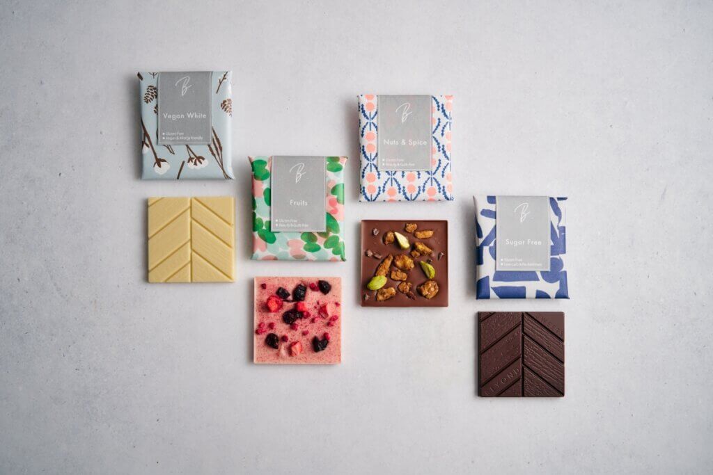 商品名:タブレットショコラ「シュガーフリー」「ナッツ&スパイス」「フルーツ」「ヴィーガン・ホワイト」