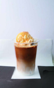 『BLITZ COFFEE』は、岐阜市内でいち早くスタンドスタイルを取り入れた、テイクアウト専門のコーヒー店。アイスドリンクの需要は高く、エスプレッソを使った各種アレンジドリンク、数種類の豆から選べるドリップコーヒー(128ページで紹介)や、、夏場には限定メニューのコールドブリユーも用意する。エスプレッソを使用した、ラテやトニックなどのアレンジドリンクも評判で、「ラテフロート」はミルクとアイスクリームに、エスプレッソを注いで作る人気ドリンク。ミルクは乳脂肪分3.5%、アイスクリームはバこラビーンズ入りで、いずれもコクのある濃厚なタイプ。これらに負けないよう、エスプレッソはダブルショットを使用しており、飲み終えた後も、深くビターな余韻が続く。
