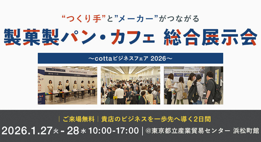 製菓・製パン・カフェ関係者必見! 製菓・製パン業界最大級のオンラインショップを運営する株式会社cottaが、つくり手とメーカーをマッチングするビジネスフェアを開催します。