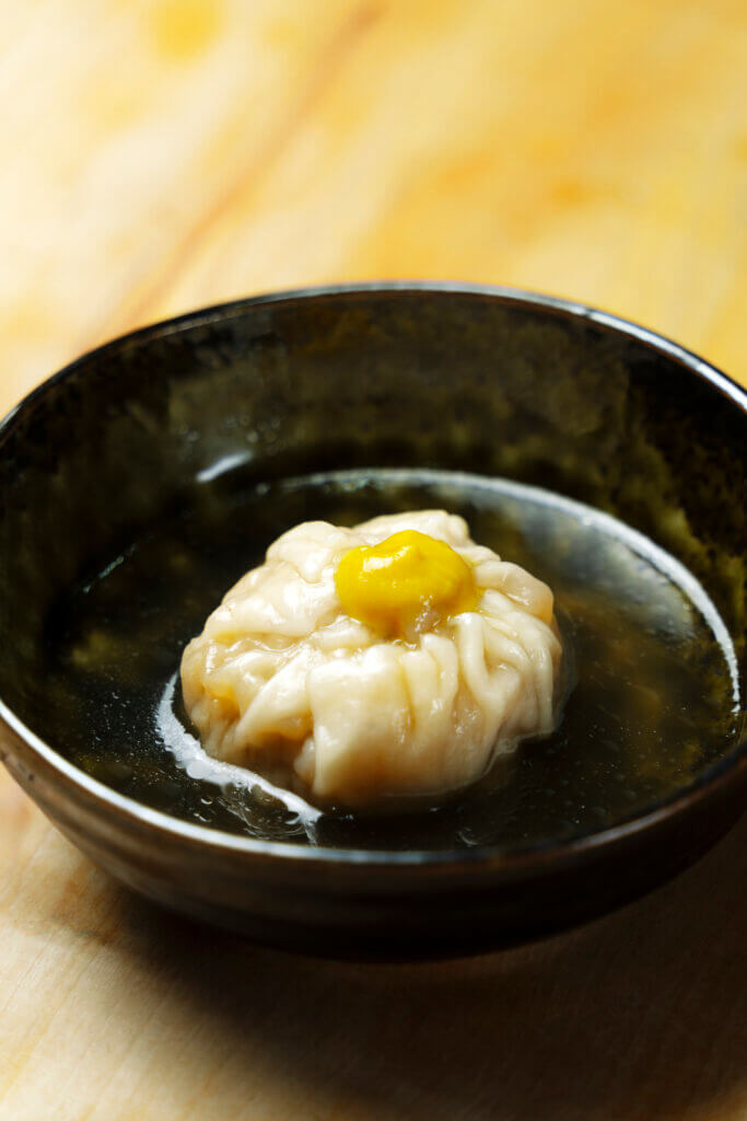 肉汁たっぷりの名物「しゅうまい」。皮から手作りし、豚の背脂をたっぷり加えた特製の餡を包んで冷凍。注文ごとに蒸してから、さっと温める程度におでん鍋に入れ、おでんだしの風味をまとわせて提供します。 |