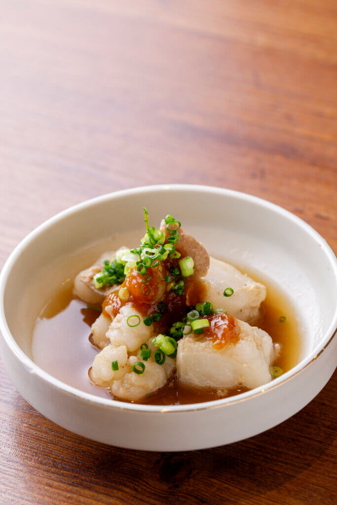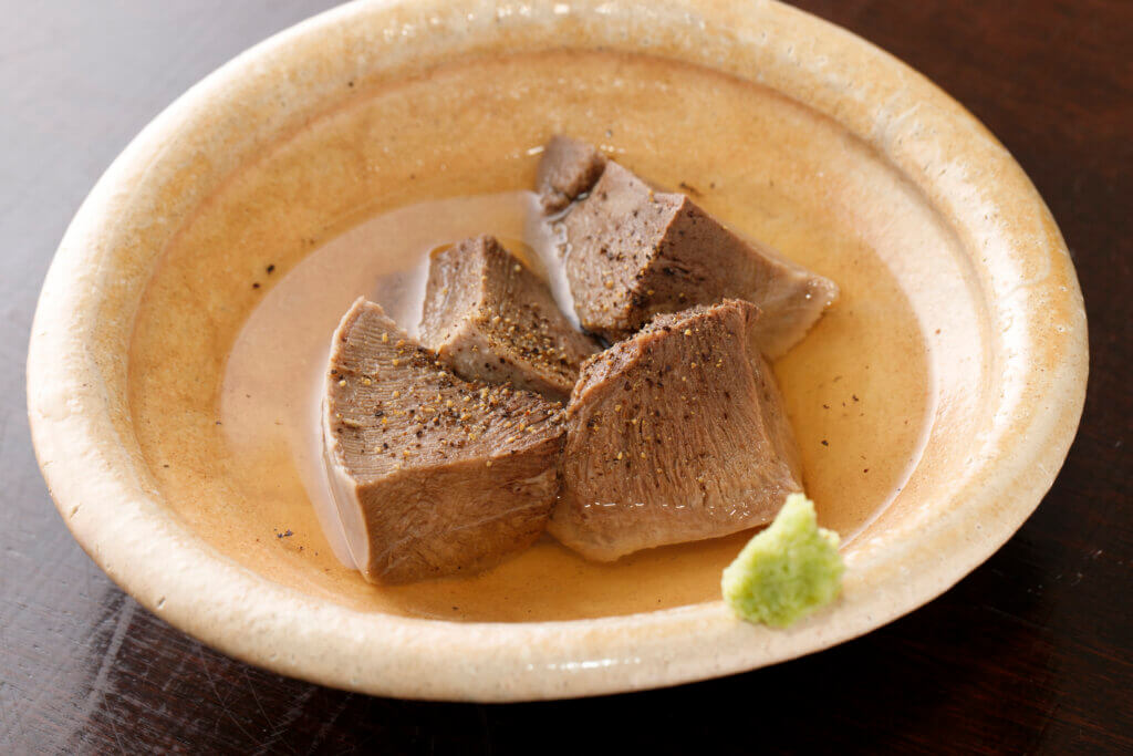 牛タン専門店で食べた「茹でタン」をヒントに開発した同店の名物おでん。タンは豚タンを丸ごと一本使用し、白だしと水を合わせた煮汁で調味します。一皿にタン先、タン中、タン元をバランスよく入れ、タンの部位ごとのおいしさを楽しめます。おでんだしをかけ、味を引き締める黒胡椒をかけて提供。好みでワサビをつけて食べます。 |
