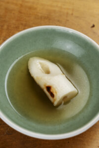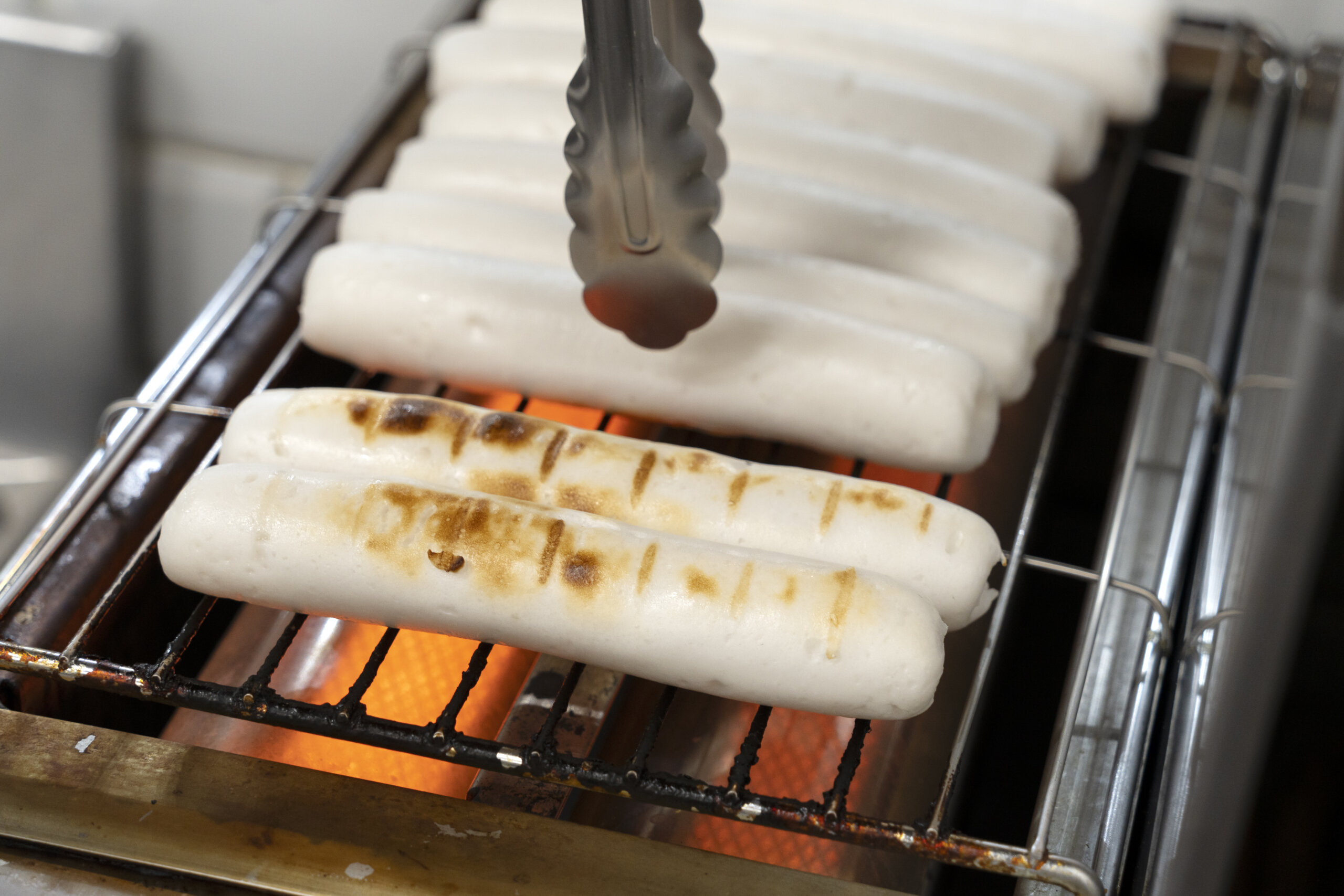 自家製のちくわは、店名にもなっている同店の看板商品。スケトウダラの生のすり身を仕入れ、水だけを加えてフードプロセッサーで混ぜ合わせ、ステンレスの棒に巻き付ける。片栗粉は加えず、スチコンで蒸して固まるギリギリまで加水率を高めることで、既製品とはひと味違う柔らかさに。表面を香ばしく焼き上げ、おでん鍋に入れて提供。