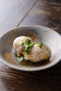 季節の食材を使った自家製のつみれも名物おでんの一つ。写真はエビとトウモロコシの組み合わせ。自家製のエビのすり身とはんぺんと白身魚を合わせてベースの生地を作り、トウモロコシの実の部分を混ぜ込み、成形して白だしを加えた煮汁で加熱してつみれを作ります。ベースの生地に加えるエビをカニやタコにするなど、随時アレンジして楽しませています。