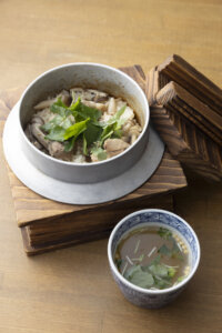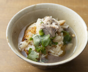店名にもなっている、しめの名物として提供する釜飯。おでんだしのベースとなる「もとだし」を使い、おでん屋ならではのしめの料理として開発。炊き立ての釜飯と共におでん鍋のだしも蕎麦猪口に入れて提供し、まずは釜飯とスープとして、次に「だし茶漬け」としても楽しめるよう、一品で2度おいしい料理を考案。
