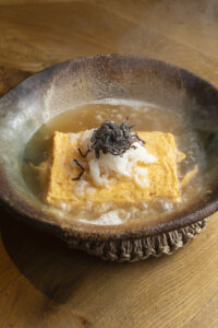 来店客ごとに注文が入る人気メニュー。おでんだしを使っただし巻き玉子を、煮込む工程を見せることで「おでんを表現したい」と土鍋で提供。グツグツとおでんだしが沸き、中に入れただし巻き玉子がフルフルと踊る様子が大好評。鬼おろしで食感をプラス。 |