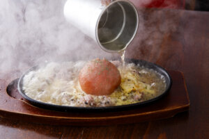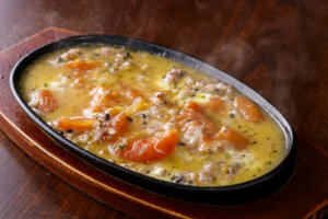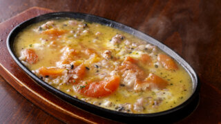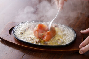 しめのご飯ものとして来店客が全員注文するという、まかないから生まれた人気のリゾット。熱した鉄板に雑穀米とチーズ、おでんの「名物とまと」を丸ごと入れて客席に運び、目の前でおでんだしをかけ、焼いていきます。一面に蒸気が漂う強烈なシズル感、おでんだしやトマト、チーズなどが合いまった複雑な旨みが好評となっています。雑穀米は黒米を混ぜており、プチっとした食感も楽しい一品です。 |